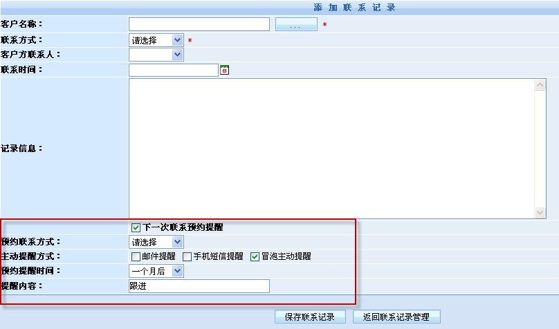 可以對客服人員對每個(gè)客戶的每一次聯(lián)系記錄進(jìn)行管理,包括通過電話、QQ、郵件等各種不同方式進(jìn)行的聯(lián)系均可錄入進(jìn)去記錄在案,以方便客戶人員查看自己所有的客戶聯(lián)系記錄,更可供相關(guān)企業(yè)管理人員隨時(shí)查看下屬客服人員對每個(gè)客戶的聯(lián)系、跟進(jìn)情況。并且,客戶聯(lián)系記錄還可與預(yù)約提醒配合起來一起使用,客服人員在每次添加客戶聯(lián)系記錄時(shí)還可同時(shí)為該客戶添加下次聯(lián)系的預(yù)約提醒,這樣便大大便捷了客服人員對客戶的跟進(jìn)和聯(lián)系。