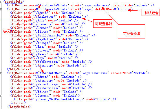 IIS 7 完全整合 .NET 之后,這些 ASP.NET 模塊不只能處理 ASP.NET 網(wǎng)頁(yè)程序,也能處理其他如 ASP 程序、PHP 程序或靜態(tài) HTML 網(wǎng)頁(yè),也因?yàn)?ASP.NET 的諸多功能已經(jīng)成為 IIS 7 的一部份,因此 ASP 程序、PHP 程序或靜態(tài) HTML 網(wǎng)頁(yè)等類型的要求,也能使用像是Forms認(rèn)證(Forms Authentication)或輸出緩存(Output Cache)等。因此,默認(rèn)情況下HTTP Module需要處理更多沒(méi)有必須的工作。如css、jpg、gif、html等某些不需要HTTPModule檢查的請(qǐng)求會(huì)浪費(fèi)系統(tǒng)很多沒(méi)有必要的性能。為了解決這個(gè)問(wèn)題,我們對(duì)HTTPModule模塊化和可配置等改進(jìn)。重新合理調(diào)整HTTPModule的功能模塊,使其各施其職。HTTPModule的可配置化,可以隨時(shí)根據(jù)不同的需求進(jìn)行調(diào)進(jìn)。